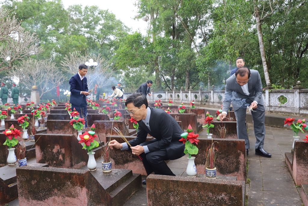 Phó Chủ tịch UBND tỉnh Đầu Thanh Tùng và các thành viên trong đoàn công tác thắp hương cho các phần mộ liệt sĩ tại Nghĩa trang liệt sĩ Nông Cống.