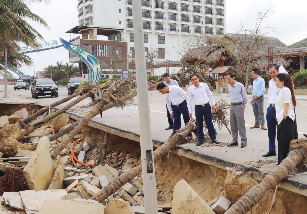 Đoàn công tác đi kiểm tra một số điểm bờ kè bãi biển bị sạt lở.